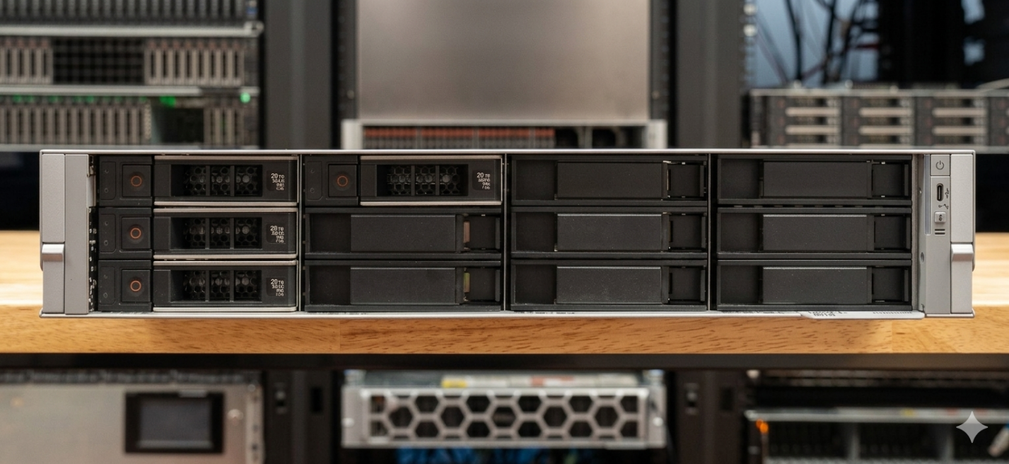 Thiết bị thử nghiệm đi kèm với thiết kế khay trước hỗ trợ 12 ổ SAS/SATA 3.5-inch, trong đó có 4 khay đã được lắp sẵn ổ cứng HDD 20 TB SATA 6 Gb/s 7.2k (LFF – khổ lớn) và 8 khay còn lại để trống cho nhu cầu nâng cấp sau này. Ngoài ra, tùy theo yêu cầu của khối lượng công việc, người dùng có thể lựa chọn cấu hình bảng mạch kết nối (backplane) khác hỗ trợ 16 ổ SAS/SATA 2.5-inch.