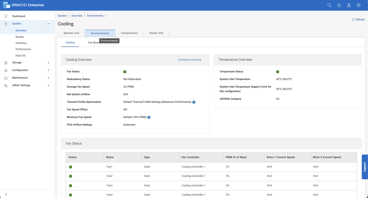 Khi truy cập sâu vào mục System Environments, quản trị viên có thể theo dõi chi tiết các thông số về làm mát, bao gồm: trạng thái hoạt động của từng quạt riêng lẻ, tốc độ vòng quay (PWM), các thiết lập cấu hình nhiệt độ (thermal profile), và các chỉ số nhiệt độ đầu vào — tất cả đều được cập nhật theo thời gian thực.