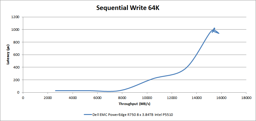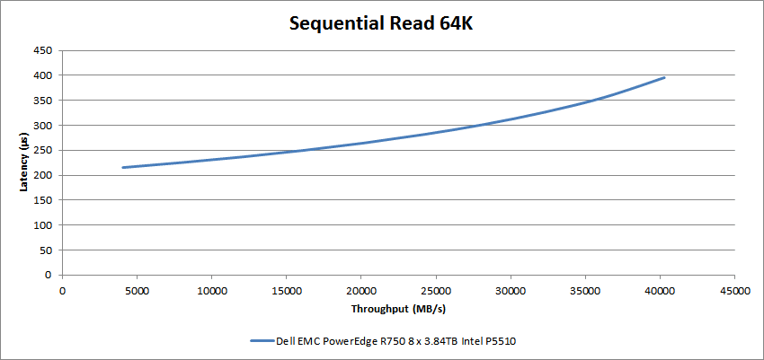 Chuyển sang 64K tuần tự, trong bài kiểm tra đọc, chúng tôi thấy R750 đạt đỉnh ở mức 644.315 IOPS hoặc 40,3GB/s với độ trễ 396µs.