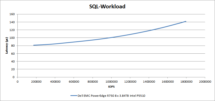 Tiếp theo là các khối lượng công việc SQL của chúng tôi: SQL, SQL 90-10 và SQL 80-20. Với bài kiểm tra SQL, Dell EMC PowerEdge R750 bắt đầu ở mức 81µs và duy trì dưới 100µs cho đến khi đạt khoảng 1 triệu IOPS. Máy chủ sau đó đạt đỉnh tại 1.795.914 IOPS với độ trễ là 141µs.