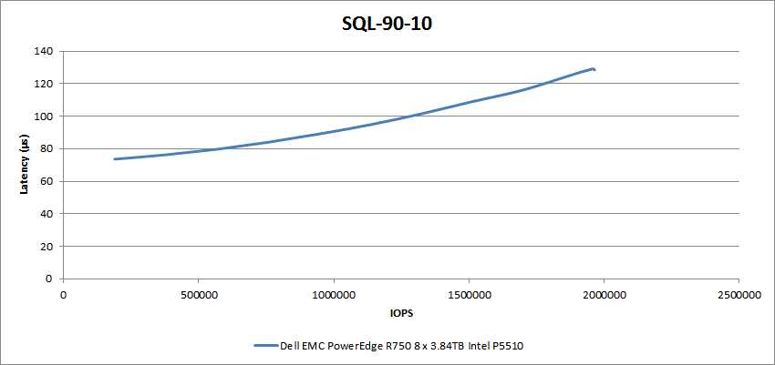 Trong bài kiểm tra SQL 90-10, máy chủ một lần nữa bắt đầu với độ trễ rất thấp (74µs) và duy trì dưới mức 100µs cho đến khi đạt khoảng 1,2 triệu IOPS, trước khi tiến tới đạt đỉnh tại 1.964.961 IOPS với độ trễ là 129µs.