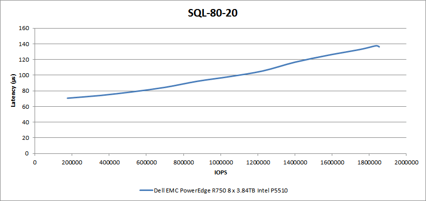 Bài kiểm tra SQL 80-20 bắt đầu với độ trễ 71µs và tiếp tục đạt đỉnh ở mức 1.854.051 IOPS với độ trễ là 136µs.