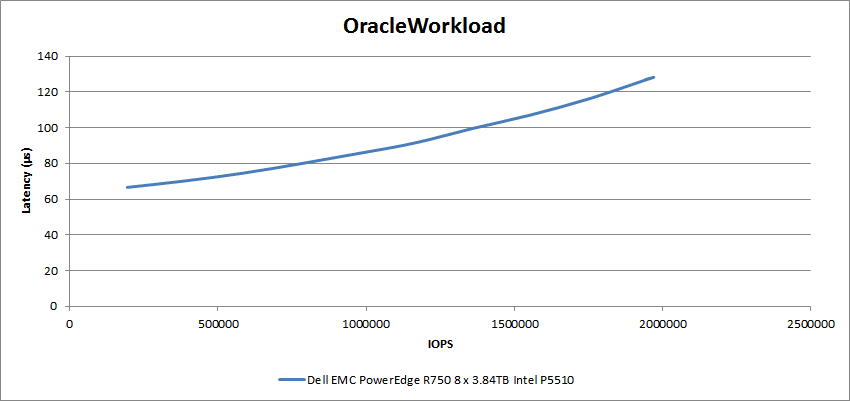 Tiếp theo là các khối lượng công việc Oracle của chúng tôi: Oracle, Oracle 90-10 và Oracle 80-20. Với bài kiểm tra Oracle, R750 tiếp tục duy trì mức độ trễ thấp khi bắt đầu (67µs) và đạt đỉnh ở mức 1.970.078 IOPS với độ trễ là 128µs.