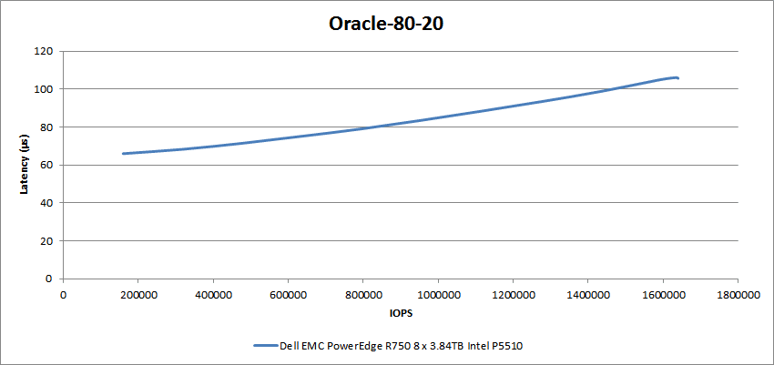 Bài kiểm tra Oracle 80-20 một lần nữa cho thấy R750 duy trì hiệu năng với độ trễ dưới 100µs trong phần lớn thời gian thử nghiệm. Tại đây, chúng tôi đã ghi nhận mức đỉnh là 1.639.511 IOPS và độ trễ là 106µs.