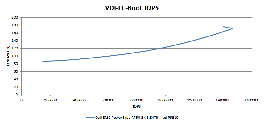 Tiếp theo, chúng tôi chuyển sang bài kiểm tra nhân bản VDI (VDI clone test), bao gồm Full Clone và Linked Clone. Đối với bài kiểm tra khởi động VDI Full Clone (FC) Boot, Dell EMC PowerEdge R750 đạt đỉnh ở mức 1.465.986 IOPS với độ trễ chỉ 172µs trước khi giảm nhẹ.
