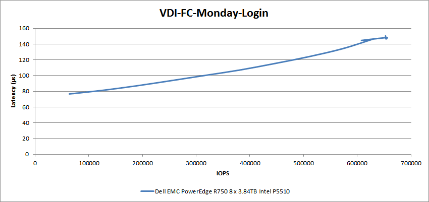 Trong bài kiểm tra VDI FC Monday Login, máy chủ duy trì độ trễ dưới 100µs cho đến khi đạt khoảng 318.000 IOPS và tiếp tục đạt đỉnh ở mức 653.534 IOPS với độ trễ là 148µs.
