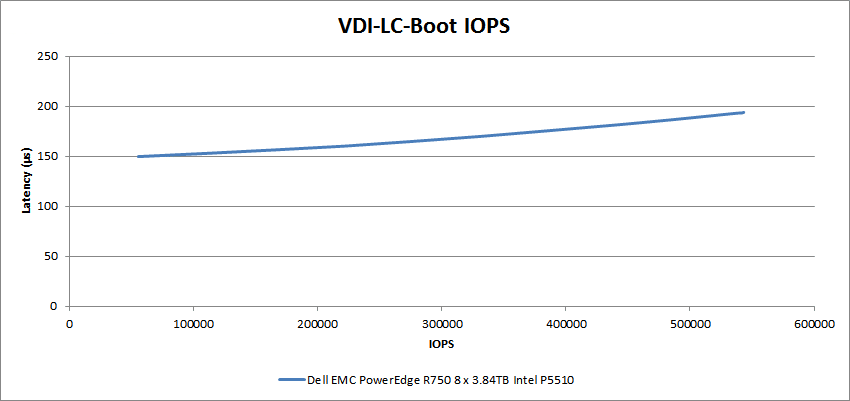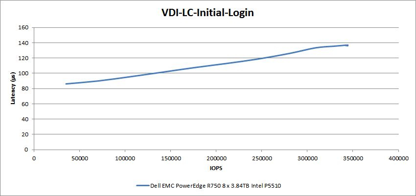 Trong bài kiểm tra VDI LC Initial Login, R750 khởi đầu với độ trễ chỉ 86µs, sau đó tiếp tục đạt đỉnh ở mức 344.327 IOPS và độ trễ là 136µs.