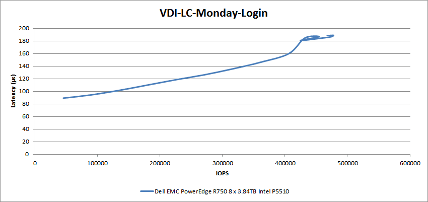 Cuối cùng, với bài kiểm tra VDI LC Monday Login, chúng tôi đã ghi nhận mức điểm đỉnh là 477.877 IOPS và độ trễ là 189µs.