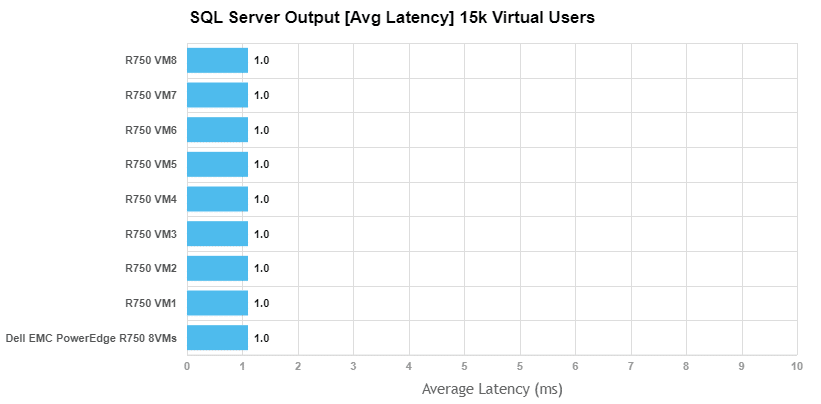 Đối với độ trễ trung bình của SQL Server, Dell EMC PowerEdge R750 duy trì độ trễ 1ms xuyên suốt với 8VM.