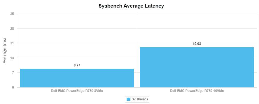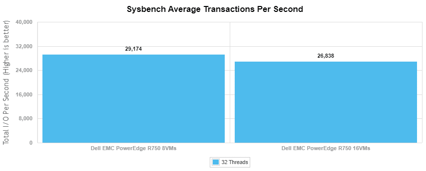 - Sysbench: Với thiết lập 8VM, hệ thống đạt tổng điểm 29.174 TPS, độ trễ trung bình 8,77ms và độ trễ trong kịch bản xấu nhất là 15,2ms. Với 16VM, tổng điểm đạt 26.838 TPS, độ trễ trung bình 19,1ms và độ trễ xấu nhất là 35,4ms. Mặc dù hiệu năng có giảm nhẹ dưới mức tải cao hơn, nhưng kết quả của 8VM thực sự rất ấn tượng—đây là một trong những mức tổng điểm 8VM cao nhất mà chúng tôi từng ghi nhận.