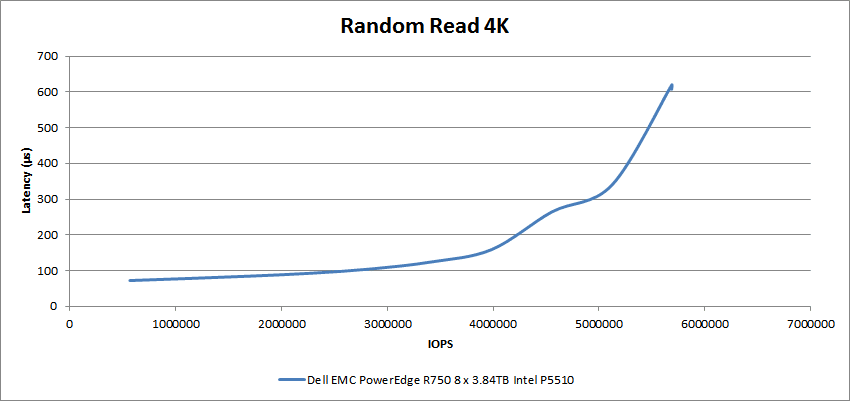 Nhìn vào kết quả đọc 4K ngẫu nhiên, Dell EMC PowerEdge R750 bắt đầu ở mức dưới 100µs và duy trì mức đó cho đến khi đạt khoảng 2,85 triệu IOPS, sau đó đạt đỉnh tại 5.686.821 IOPS với độ trễ là 608µs.