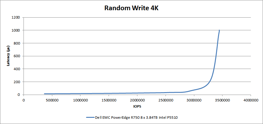 Ghi nhận một khởi đầu ấn tượng với kết quả ghi 4K ngẫu nhiên khi độ trễ chỉ ở mức 15,1µs và duy trì dưới 100µs cho đến khi máy chủ vượt qua mức 3 triệu IOPS. R750 đạt đỉnh tại 3.444.352 IOPS với độ trễ 986µs.