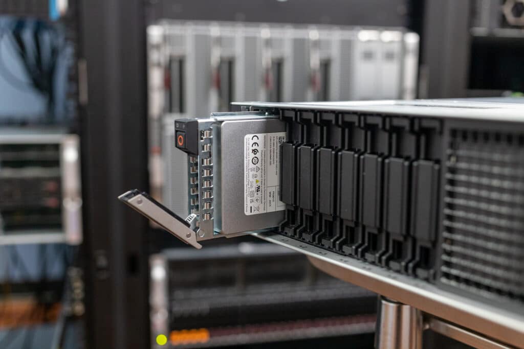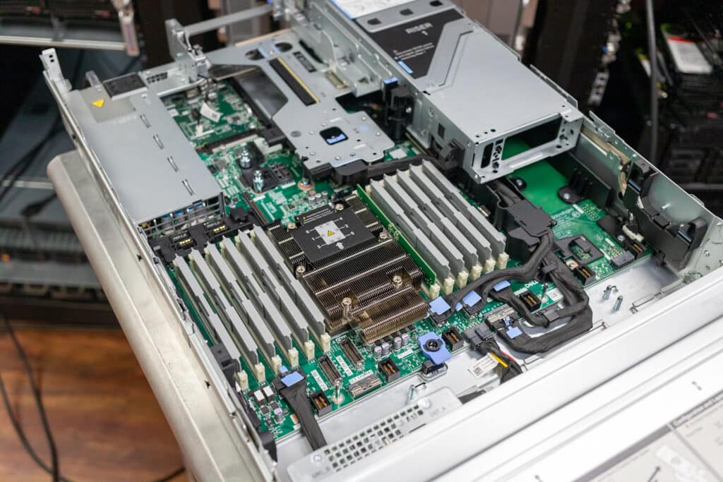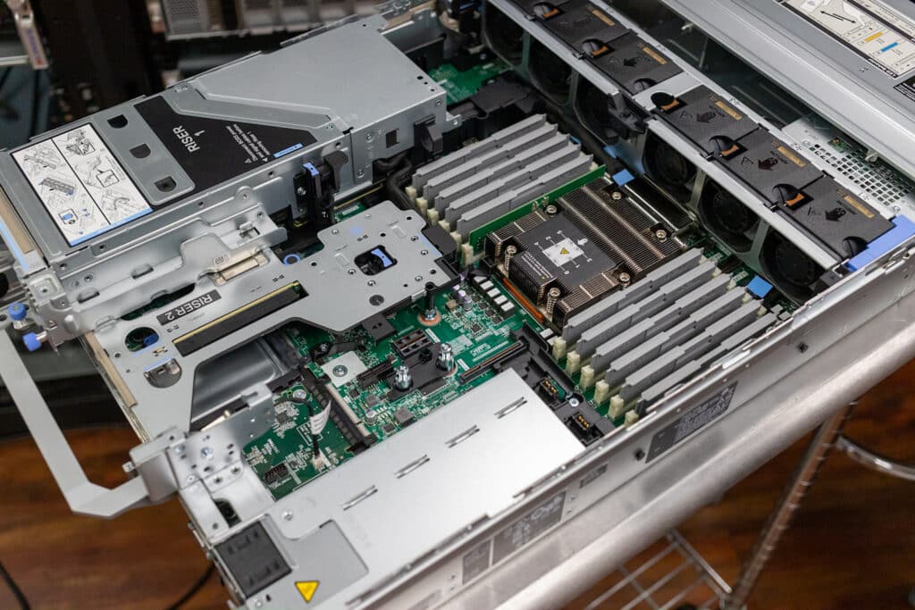 Việc lưu trữ được đảm nhiệm bởi một ổ SSD NVMe chuyên dụng cho đọc (read-intensive) dung lượng 960GB, mức dung lượng này sẽ cung cấp tốc độ truy cập dữ liệu vừa đủ cho các mục đích chung. Mặc dù nó phản ánh đúng chủ đề tổng thể của chiếc máy chủ này là đáp ứng đủ cho các hoạt động điển hình, nhưng nó vẫn chưa khai thác hết tiềm năng thực sự của R7615. Bảng mạch PCIe, cấu hình Riser 3 và các khe cắm khác nhau cho thấy khả năng mở rộng của hệ thống. Dù có sẵn các khe cắm, chúng tôi không lắp đặt GPU nào trong cấu hình đánh giá này. Điều này chắc chắn sẽ ảnh hưởng đến cách chúng tôi kiểm tra hiệu suất của R7615 trong phần dưới đây.