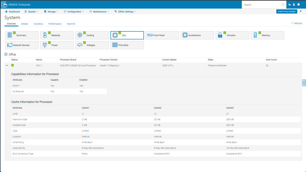 Chuyển sang phần tổng quan về CPU, giao diện của iDRAC9 cho phép người dùng đi sâu vào môi trường xử lý của máy chủ. Nó cung cấp các số liệu thống kê quan trọng và trạng thái vận hành của các CPU, chi tiết về tốc độ, số lượng nhân và các tính năng thiết yếu khác như hỗ trợ ảo hóa và chi tiết bộ nhớ đệm (cache). Phần này rất hữu ích trong việc hiểu rõ khả năng xử lý của máy chủ và đảm bảo tài nguyên CPU phù hợp với nhu cầu hiệu suất. Dọc theo phía trên của màn hình là các lối tắt giúp truy cập nhanh vào các phần chuyên sâu khác, như tình trạng pin hệ thống, bộ nhớ và thống kê mạng.
