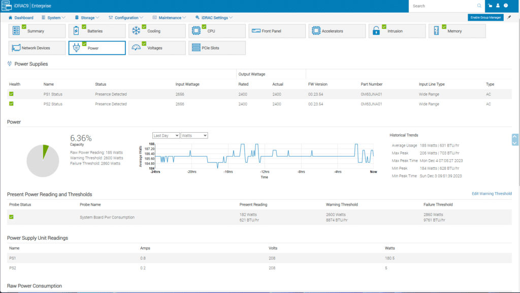 Cũng nằm trong danh sách đó là liên kết Quản lý nguồn (Power management), nơi hiển thị thông tin chi tiết về tình trạng sức khỏe và việc sử dụng bộ nguồn của máy chủ. Nó cũng cung cấp dữ liệu thời gian thực về mức tiêu thụ điện năng (chẳng hạn như công suất hiện tại). Đồng thời, tính năng này theo dõi lịch sử sử dụng, điều này rất quan trọng để quản lý chi phí vận hành và đảm bảo máy chủ hoạt động trong ngưỡng điện năng an toàn.