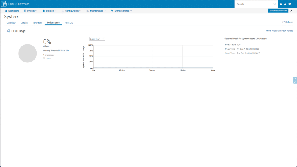 Cũng nằm trong phần thiết lập Hệ thống chính là khu vực Hiệu suất (Performance), nơi người dùng có thể truy cập biểu đồ trực quan và tương tác về mức sử dụng CPU. Công cụ phân tích này cho phép giám sát theo thời gian thực và theo dõi hiệu suất lịch sử, cung cấp những hiểu biết giá trị về hiệu quả xử lý của máy chủ trong các khoảng thời gian cụ thể (thông qua danh sách thả xuống). Đây có thể là một nguồn tài nguyên quý giá khi bạn đang tinh chỉnh hiệu suất và xác định các điểm nghẽn tiềm năng hoặc các giai đoạn sử dụng cao điểm.