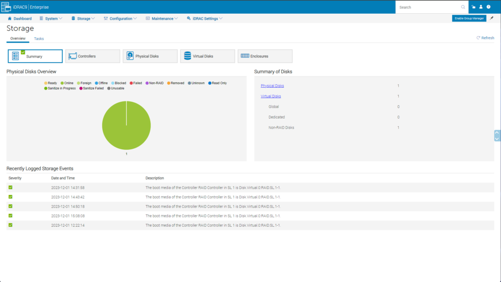 Khu vực lưu trữ có một phần phạm vi cung cấp các thông tin hữu ích. Trang tóm tắt đưa ra cái nhìn tổng quan về môi trường đĩa, hiển thị trạng thái của từng đĩa vật lý và tổng hợp cấu hình RAID. Phía dưới là nhật ký sự kiện, nơi ghi lại tất cả các hoạt động liên quan đến lưu trữ. Điều này cực kỳ giá trị cho việc bảo trì liên tục và khắc phục nhanh các sự cố khi chúng phát sinh.