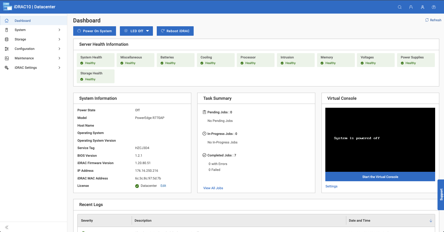 Việc quản lý từ xa cho R770AP được đảm nhiệm bởi iDRAC10, đây cũng là nền tảng tiêu chuẩn mà Dell trang bị trên toàn bộ dòng sản phẩm PowerEdge thế hệ thứ 17, bao gồm cả các mẫu PowerEdge R770 và PowerEdge R7725 mà chúng tôi đã đánh giá trước đây. Giao diện được thiết kế đồng nhất trên toàn bộ danh mục sản phẩm, vì vậy những quản trị viên đã quen thuộc với iDRAC trên các nền tảng PowerEdge khác sẽ cảm thấy vô cùng gần gũi.
