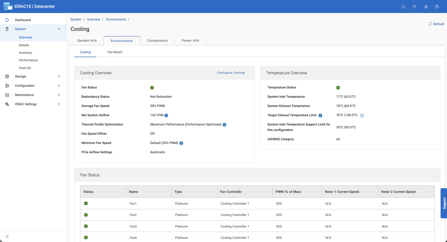 Truy cập sâu vào phần Môi trường hệ thống (System Environments), ta sẽ thấy các chi tiết về tản nhiệt, bao gồm trạng thái của từng quạt riêng lẻ, tốc độ điều xung PWM, các thiết lập cấu hình nhiệt và chỉ số nhiệt độ đầu vào, tất cả đều theo thời gian thực. Điều này đặc biệt hữu ích cho việc kiểm chứng lưu lượng khí trong các cấu hình tủ rack mật độ cao hoặc khắc phục các sự cố về nhiệt mà không cần phải tiếp cận trực tiếp máy chủ.