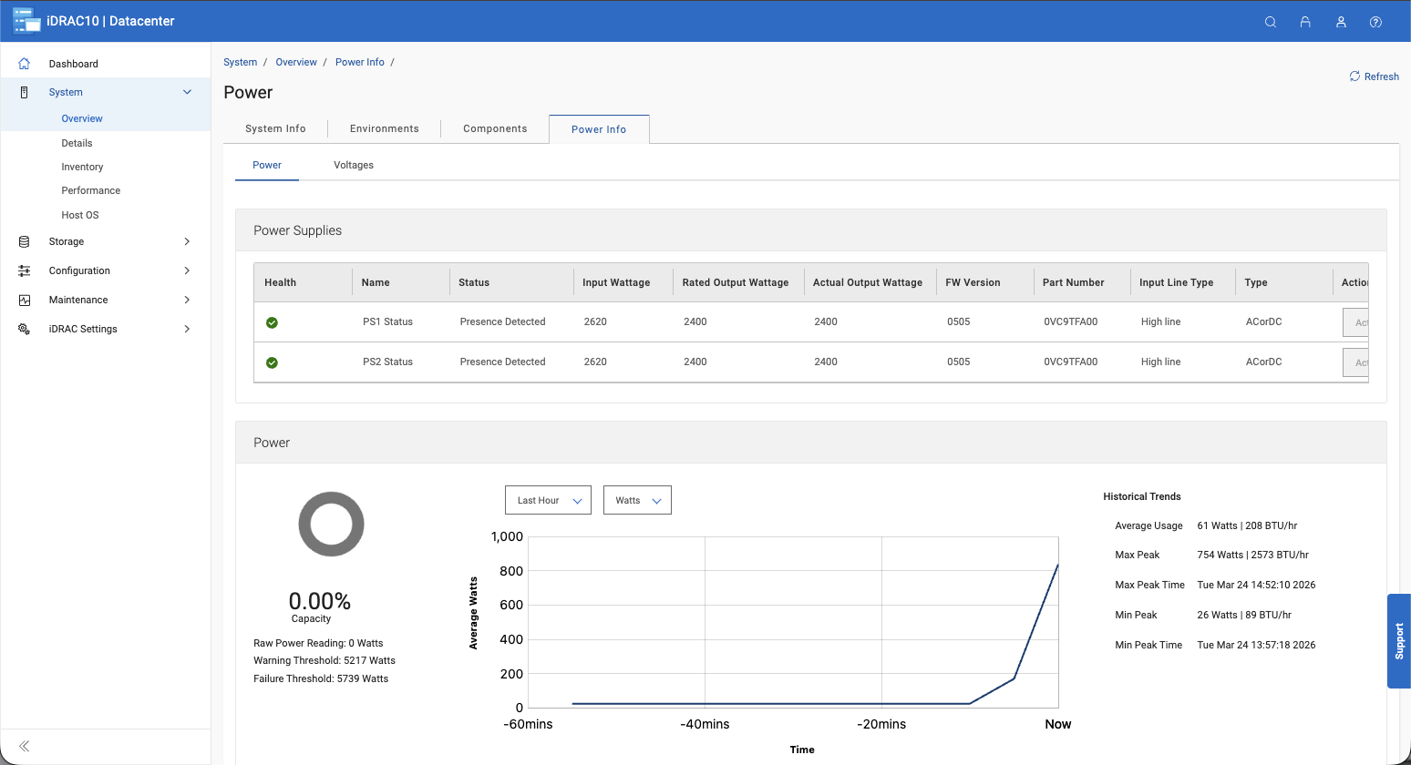 Khả năng hiển thị thông số nguồn điện cũng tuân theo mô hình tương tự. Phần Thông tin nguồn điện (Power Info) phân tích chi tiết tình trạng bộ nguồn (PSU), dòng điện tiêu thụ và mức độ sử dụng công suất, bên cạnh một biểu đồ xu hướng lịch sử liên tục. Các quản trị viên có thể nhanh chóng xem được công suất trung bình và đỉnh theo thời gian, điều này rất có giá trị cho việc lập kế hoạch công suất và xác định các đợt tăng vọt điện năng do tác vụ gây ra mà không cần đến một công cụ giám sát nguồn điện riêng biệt.