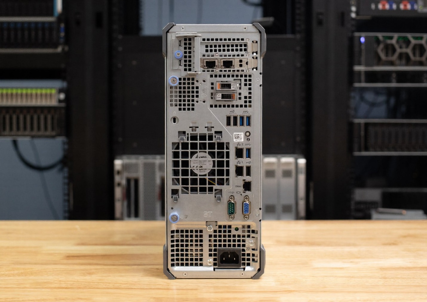 Mặt sau của máy chủ có nhiều tùy chọn kết nối và một bộ nguồn duy nhất. Dell cung cấp các tùy chọn nguồn 300W chuẩn Bronze hoặc 500W chuẩn Platinum tùy thuộc vào cấu hình. Những người dùng máy chủ thuần túy sẽ mong muốn bộ nguồn đôi (PSU) trong thiết kế này, nhưng điều đó đơn giản là không được định sẵn. Dell đã chọn ưu tiên chi phí và kích thước nhỏ gọn với T160; dù vậy, Dell vẫn cung cấp các dòng máy chủ dạng tháp lớn hơn với thiết kế nguồn dự phòng.